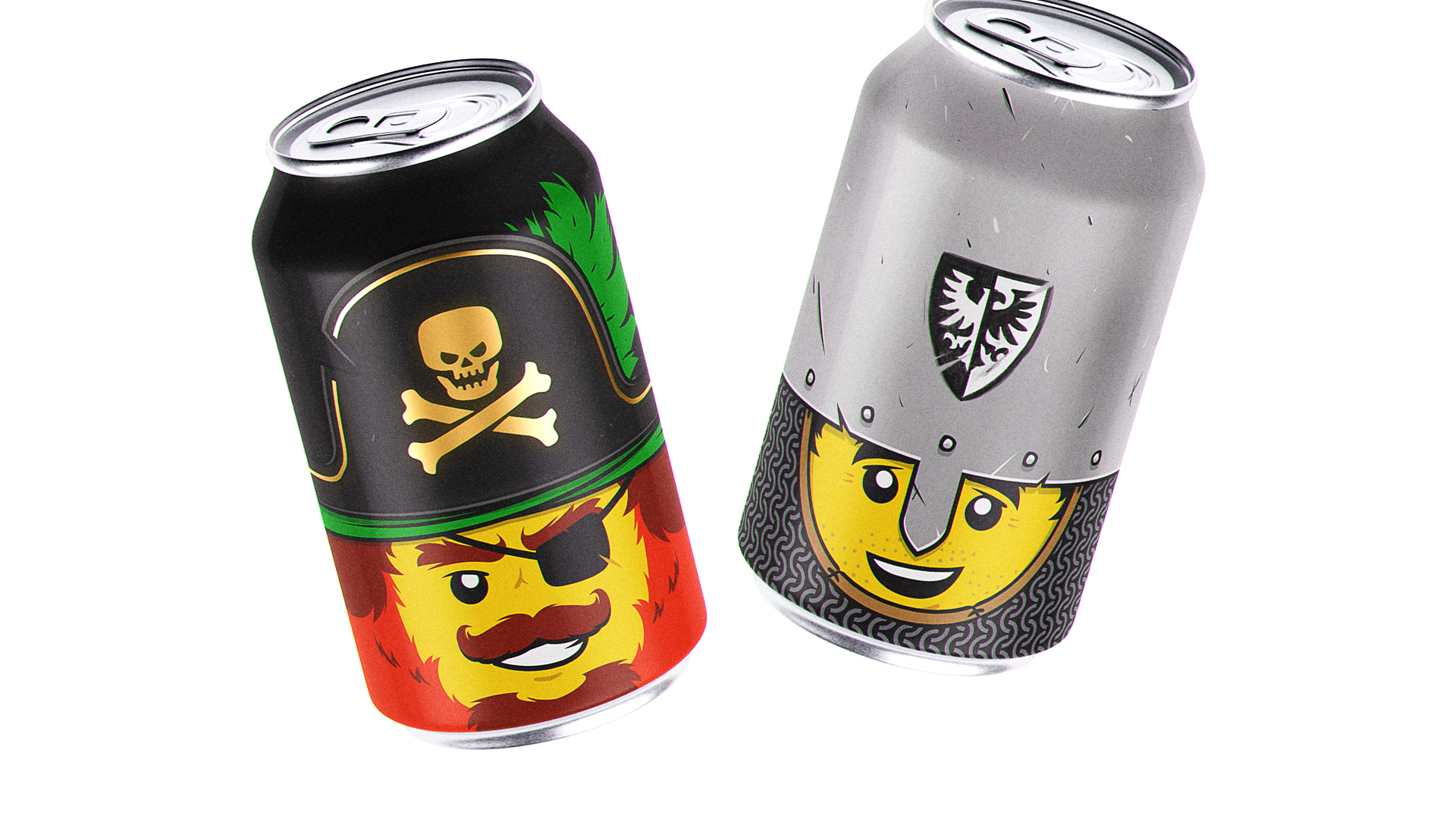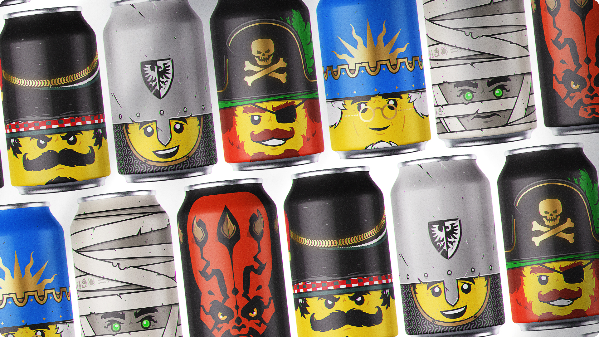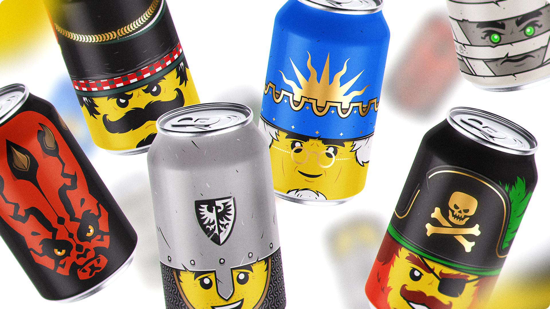 Ce projet personnel, entamé en 2017 et affiné jusqu’en 2025, est une exploration graphique autour d’un concept simple et décalé : transformer les têtes emblématiques de figurines LEGO en canettes collector.