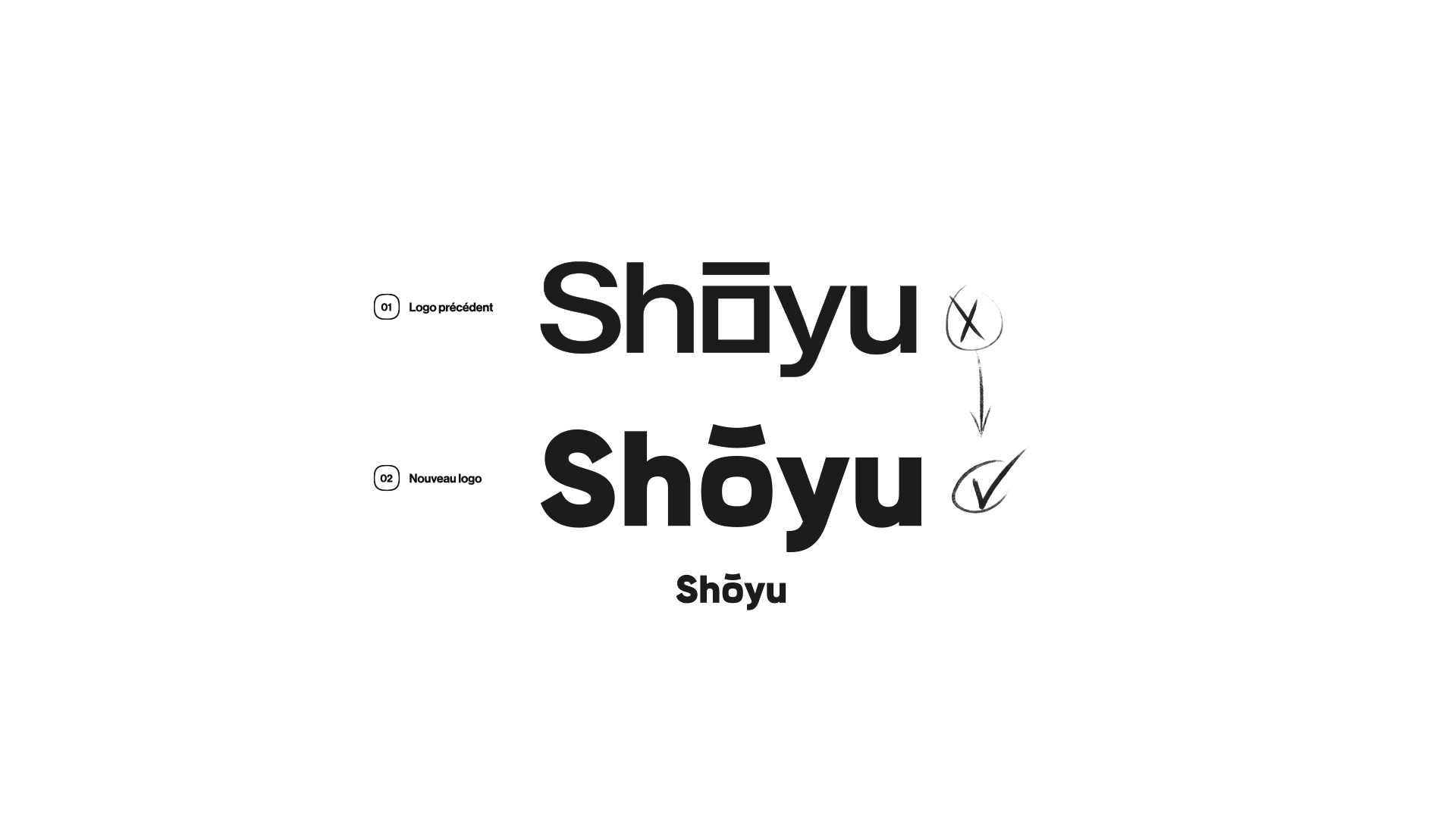 La seule contrainte imposée était de conserver le nom, l’idée originale du logotype, ainsi que la palette noir et blanc. Mon objectif a été d’adapter ce symbole aux nouvelles valeurs de Shōyu : accessibilité et modernité.