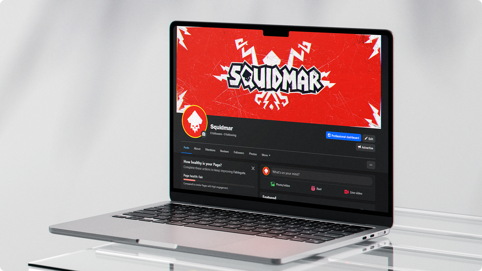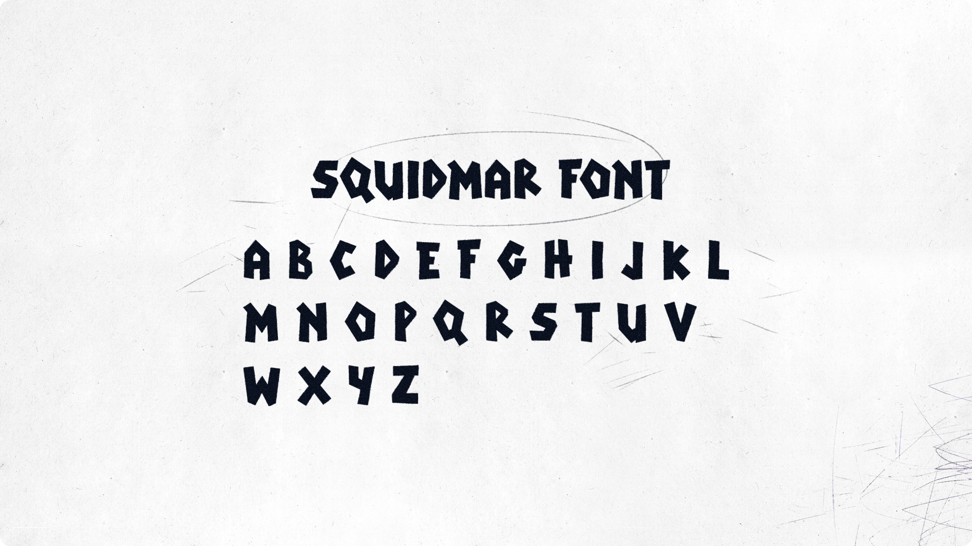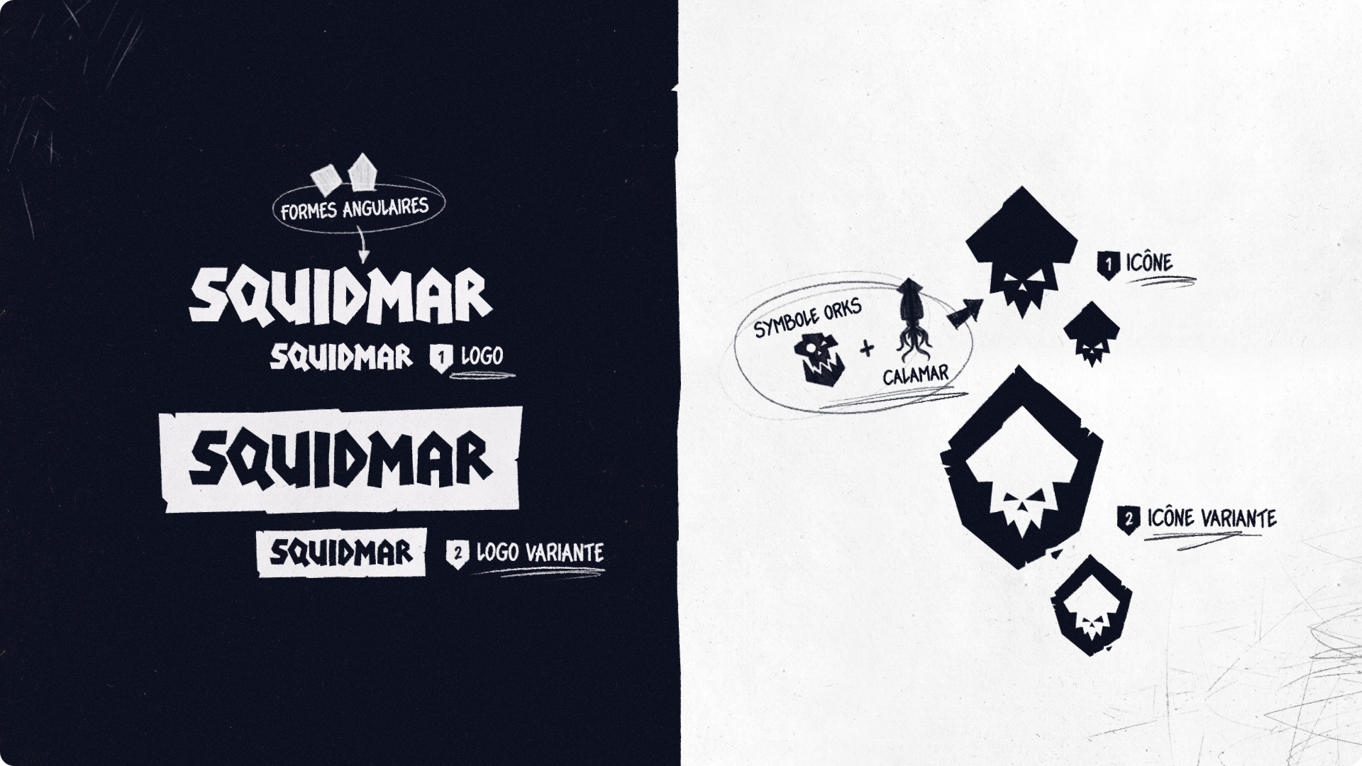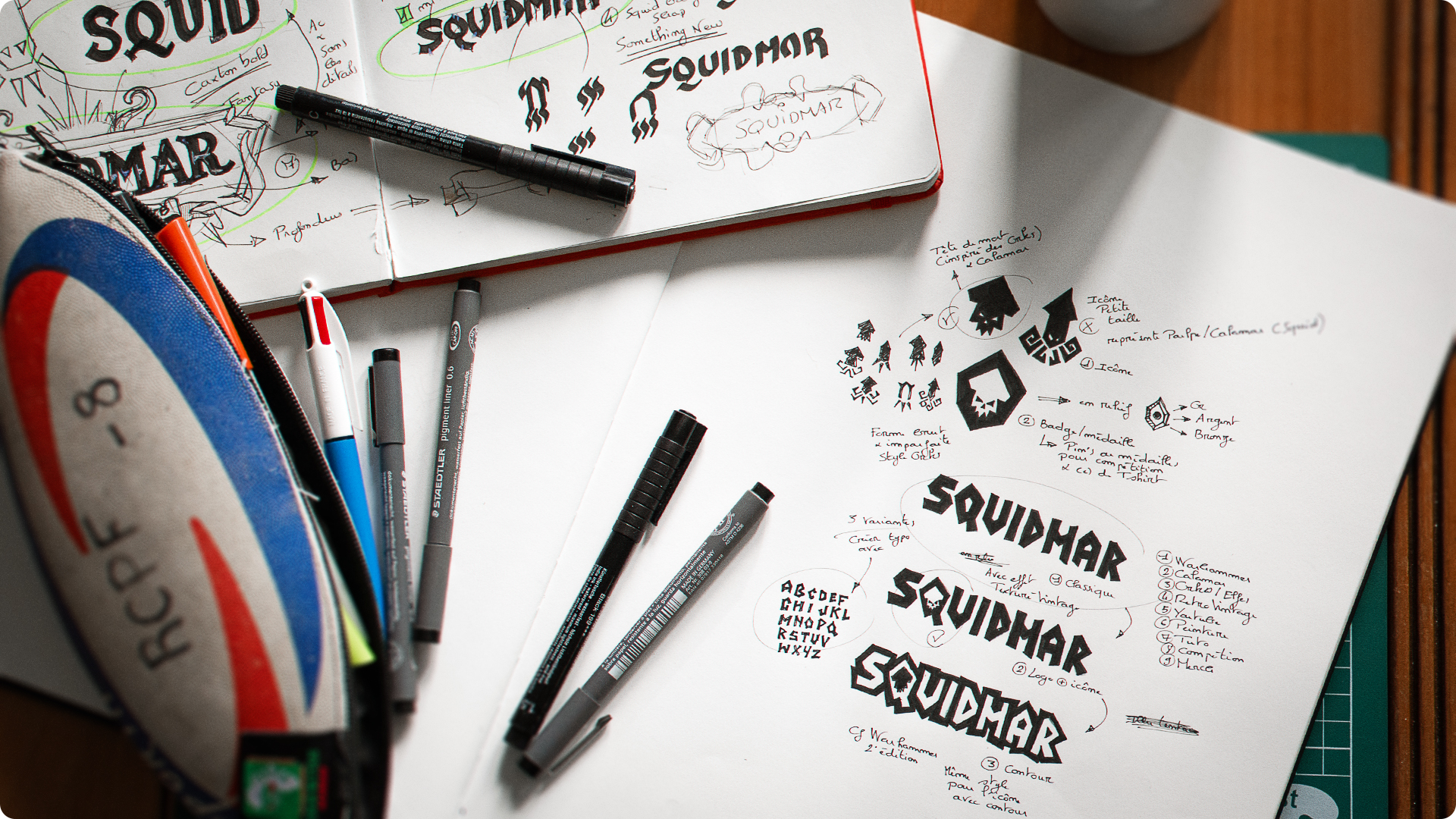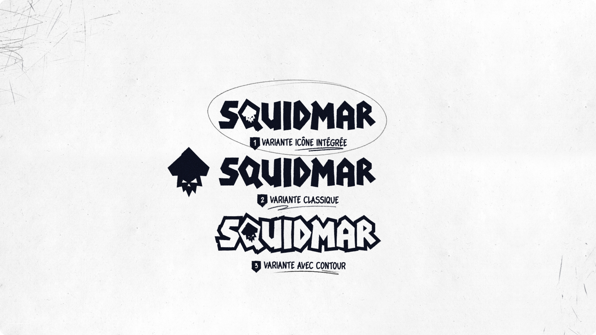 Pour le logo, J’ai conçu une typographie sur mesure (également déclinée en police d’écriture) complété par une icône représentant un calamar stylisé, reprenant les formes d’un crâne (un motif emblématique de Warhammer) et qui adopte le même langage graphique que la typo.