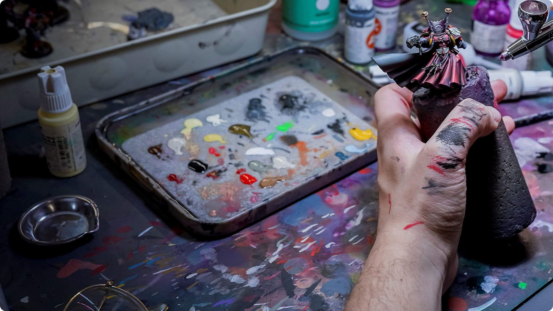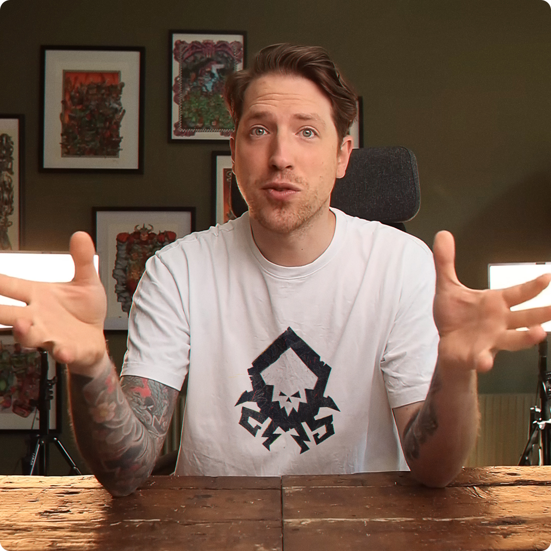 Une des particularité des visuels de Squidmar c'est l'usage de textures avec des ratures, de la saleté et d'imperfections en tout genre. C'est une manière de représenté le bureau du passionné de Warhammer, ou les traces peinture, de colles et les coup de cutters sont légions.
