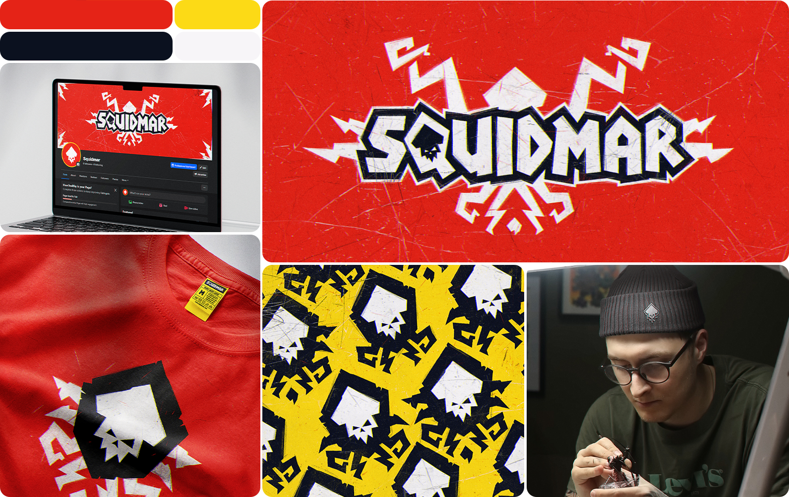 La palette de Squidmar en reprend l’esprit, avec un rouge dominant, accompagné de noir et de jaune en couleurs secondaires. Ce choix vise à ancrer l’identité de la marque dans ses racines, représenter cette époque qui a donné naissance à leur passion.