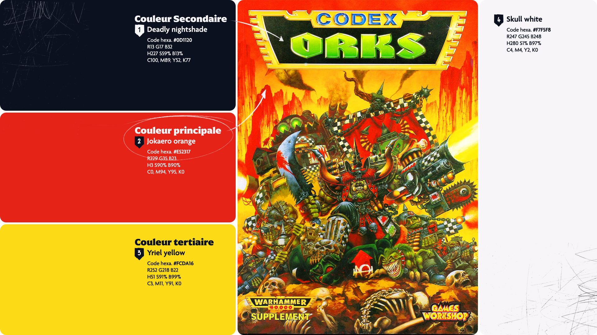 La palette de couleurs de Squidmar s’inspire des visuels emblématiques des codex Warhammer des années 1990 (seconde édition). On y retrouve les teintes caractéristiques de cette époque : le rouge, le noir, le jaune et le bleu.