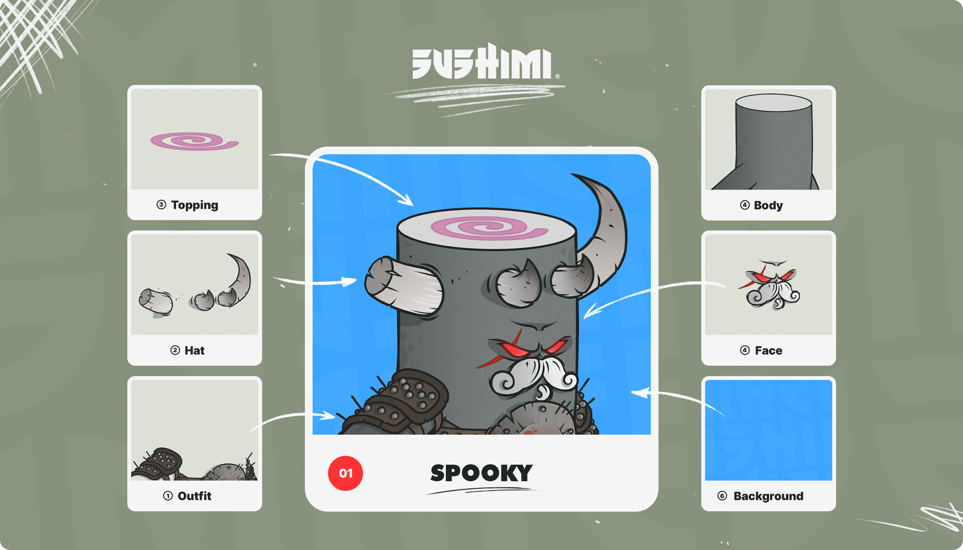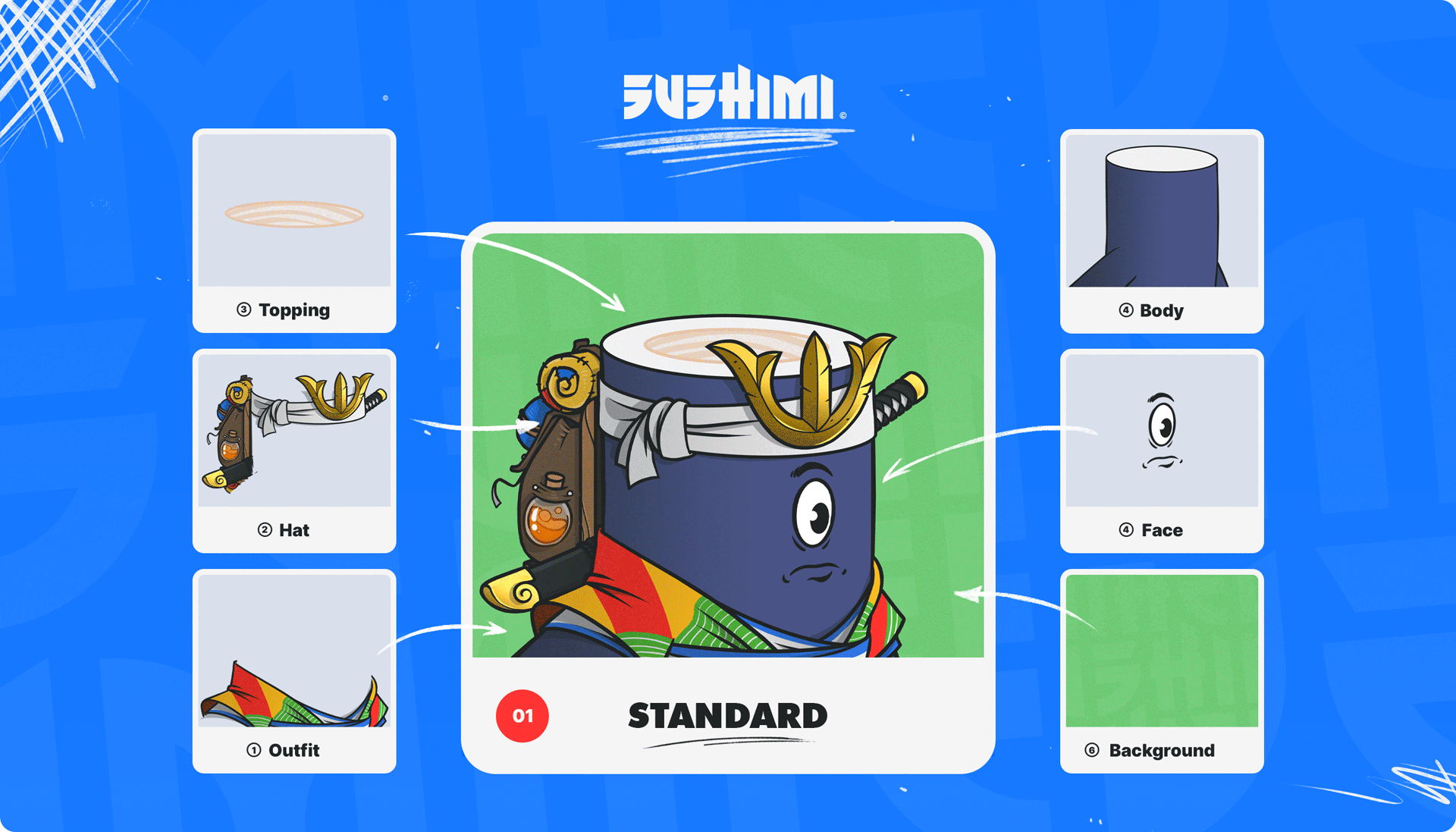 Chaque Sushi est généré de manière algorithmique à partir d’une base illustrative créé pour l'occasion, comprenant une large variété de traits : expressions faciales, chapeaux, vêtements, accessoires, etc. Ce système permet de créer une collection unique, où chaque personnage possède sa propre combinaison visuelle.